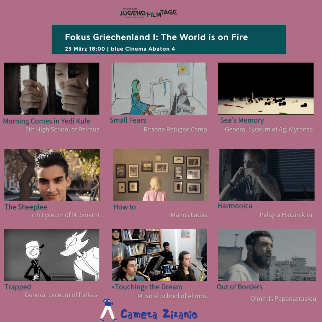 Camera Zizanio also presented a program curated for this year festival, titled “Focus: Greece,” which included a selection of films with a social and political theme titled “The World is on Fire.” The selected films were created by young people from Greece and included: “The Sheeplee” from the 7th Lyceum of N. Smirni, “Touching the Dream” from the Music High School of Alimis, “Small Fears” from the Ritsona Refugee Camp, “Morning Comes in Yedi Kule” from the 8th High School of Peiraus, “Harmonica” from Pelagia Hatzinikita, “Trapped” by the General Lyceum of Pefkes, “Out of Borders” from Dimitris Papanastasiou & “How to” from Manos Ladas.