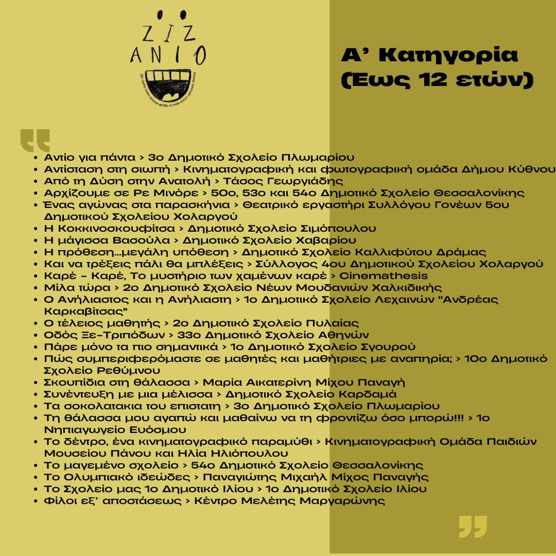 Η τελετή λήξης και η απονομή των βραβείων το Σάββατο 4/12 έβαλε και το επίσημο τέλος της 21ης Camera Zizanio και του 24ου Διεθνούς Φεστιβάλ Κινηματογράφου Ολυμπίας για Παιδιά και Νέους. Αλλά ταυτόχρονα άρχισε και η αντίστροφή μέτρηση για το επόμενο Φεστιβάλ 3 με 10 Δεκεμβρίου 2022.