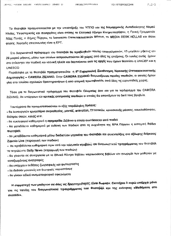 Η εγκύκλιος του Υπουργείου Παιδείας με την οποία συστείνεται η παρακολούθηση των εκδηλώσεων του 11ου Διεθνούς Φεστιβάλ Κινηματογράφου Ολυμπίας για Παιδιά και Νέους και της 8ης Camera Zizanio