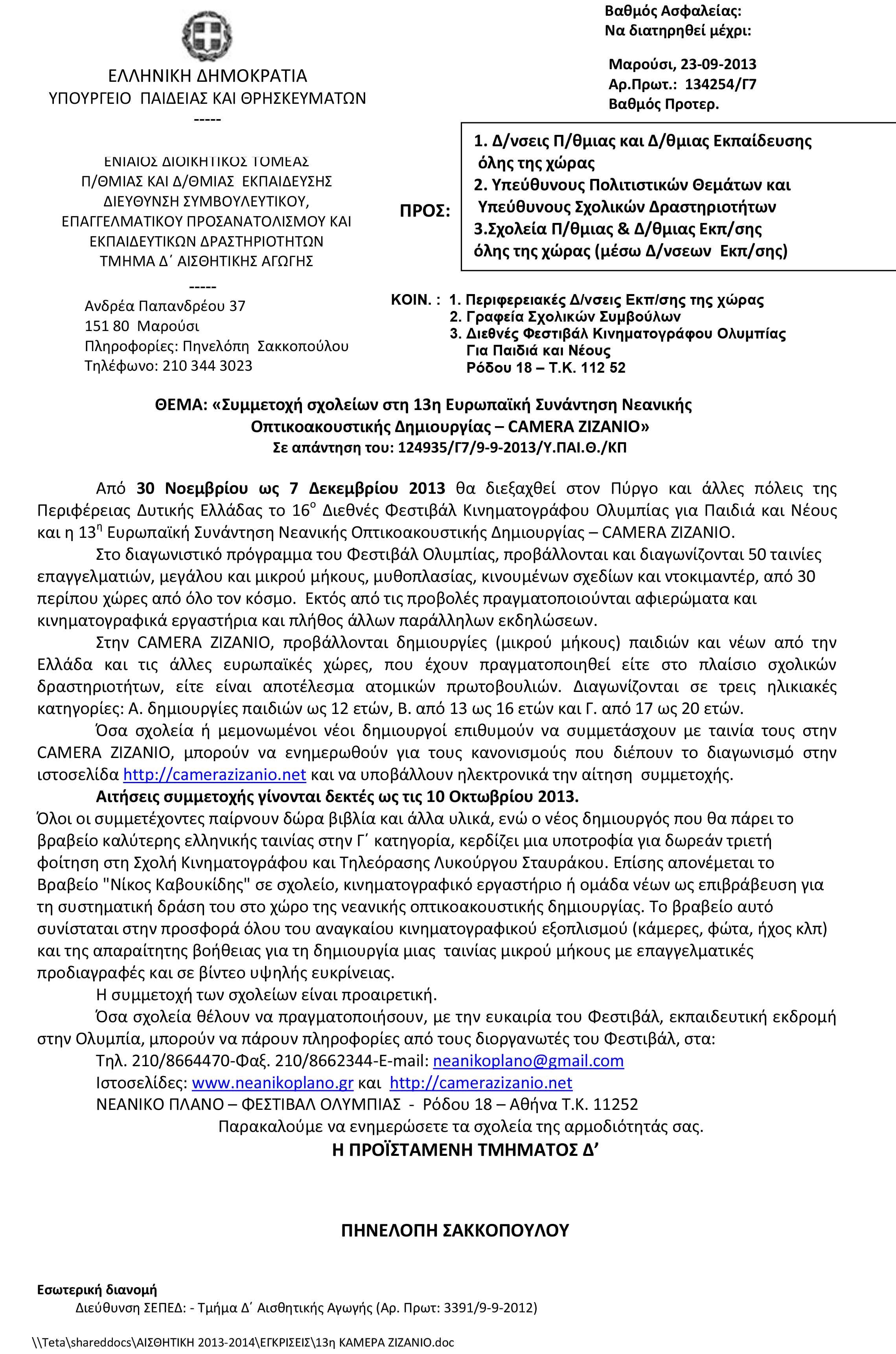 Η εγκύκλιος του ΥΠΟΥΡΓΕΙΟΥ ΠΑΙΔΕΙΑΣ ΚΑΙ ΘΡΗΣΚΕΥΜΑΤΩΝ ΠΟΛΙΤΙΣΜΟΥ ΚΑΙ ΑΘΛΗΤΙΣΜΟΥ για τη συμμετοχή μαθητών και εκπαιδευτικών στις εκδηλώσεις του 16ου Φεστιβάλ Κινηματογράφου Ολυμπίας και της 13ης Camera Zizanio