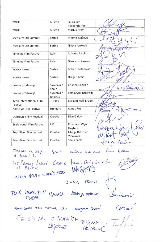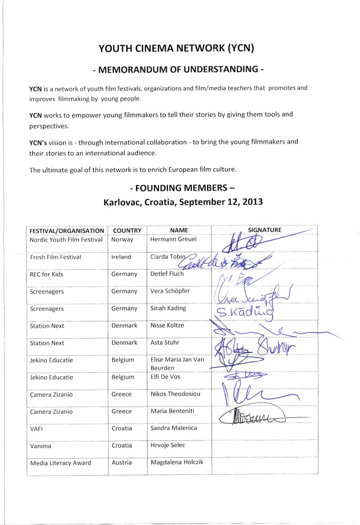 Με την υπογραφή ενός Μνημονίου (MEMORANDUM OF UNDERSTANDING) για τη δημιουργία ενός ευρωπαϊκού Δικτύου Νεανικού Κινηματογράφου (YOUTH CΙNEMA NETWORK – YCN) ολοκληρώθηκε το 2ο Σεμινάριο Ευρωπαϊκού Νεανικού Κινηματογράφου στις 12 Σεπτεμβρίου στο Karlovac της Κροατίας.